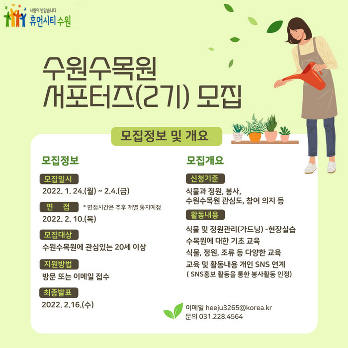 신청 서식 등 자세한 내용은 수원시 홈페이지에 게시된 ‘수원수목원 서포터즈(2기) 모집’ 공고문에서 볼 수 있다.
