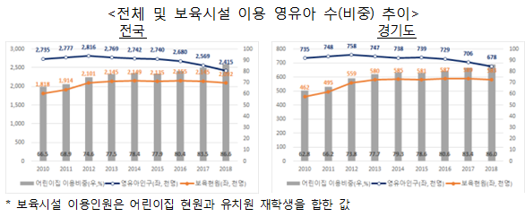 도는 보육시설의 충분한 공급으로 시설 이용을 원하는 영유아 대부분이 별다른 문제없이 어린이집이나 유치원을 이용하고 있는 것으로 분석했다.