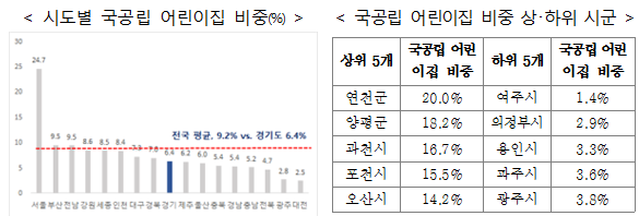 지난해 경기도 국공립 어린이집 비중은 6.4%로 서울(24.7%), 인천(9.4%)에 비해 낮다.