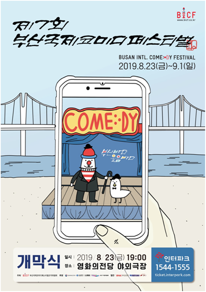 제7회 부산국제코미디페스티벌은 23일부터 9월 1일까지 10일간 영화의전당, 신세계백화점 문화홀, 부산디자인센터 이벤트홀, 시청자미디어센터 공개홀에서 펼쳐지는 유료 극장공연과 해운대 구남로(24~31일), 부산대역 문화나눔터(26일), 온천천 카페거리 앞 배드민턴장(27일), 부산환경공단 남부사업소 상부체육공원(28일), 사상 명품가로공원(29일)으로 공연팀이 직접 찾아가는 무료 야외공연으로 진행된다.