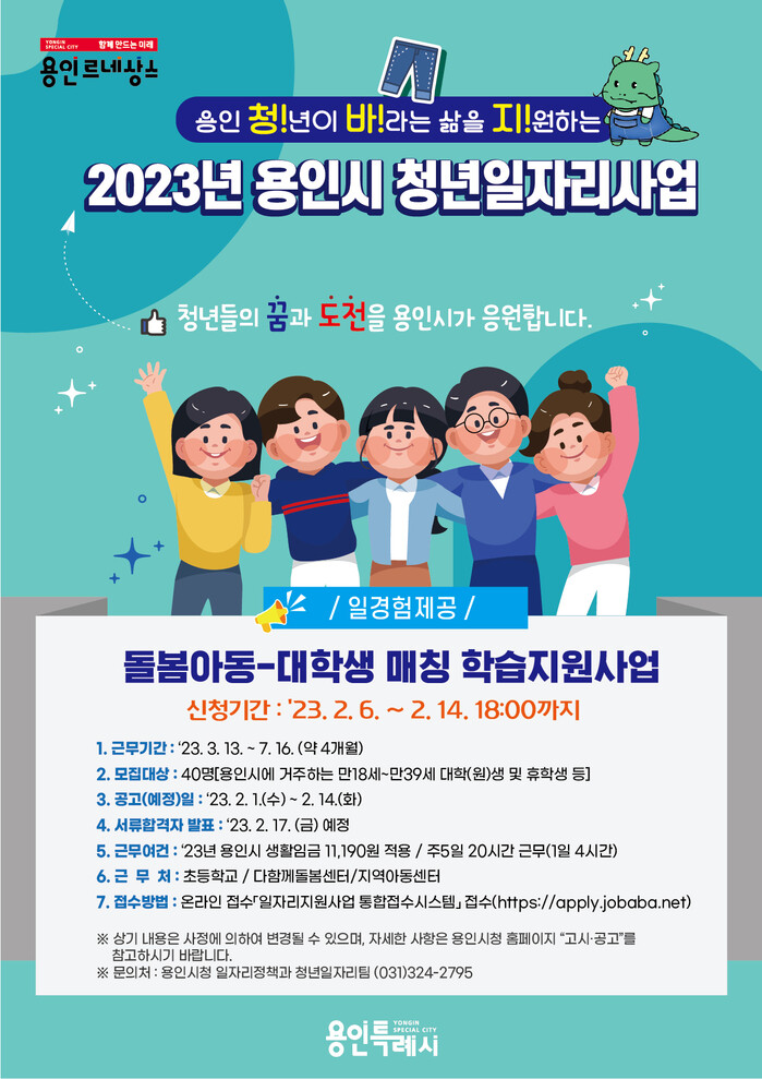 선발된 대학생은 3월 13일 사전교육을 시작으로 7월 16일까지 초등학교 돌봄교실, 다함께 돌봄센터, 지역아동센터 등에서 하루 4시간씩 주 5일 학습 도우미로 근무하게 된다. 시급은 2023년 용인시 생활임금인 1만 1190원을 받게 된다.