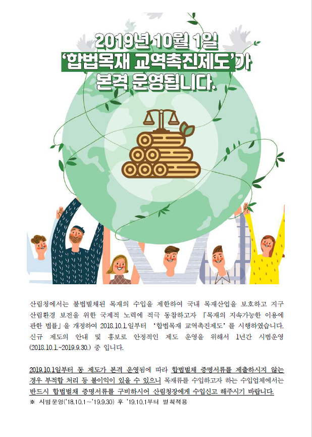 산림청에서는 이후 1년간의 시범운영기간을 거쳐 2019년 10월 1일부터 합법목재 교역촉진제도를 본격 시행중으로 수입목제품 통관이 많은 인천지역에서 지자체와 연중 합동단속을 추진함을 목재 산업계에 알렸다.