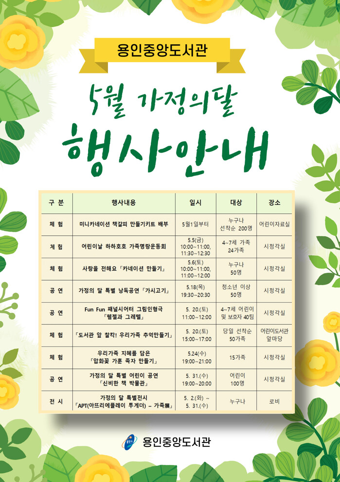 4일 가정의 달 액자만들기(구성도서관), 6일 과학마술콘서트-매직 위드 패밀리(청덕도서관), 6~28일 북크닉(서농도서관), 10일 천연비누만들기(기흥도서관), 11일 하바리움으로 마음 채우기(죽전도서관), 12일 엄마랑 아가랑 그림책으로 놀자(포곡도서관) 등이다.
