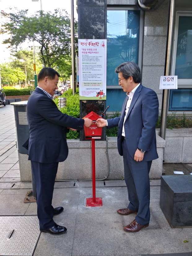 ▲햇살우편함에 편지넣는 신월5동지역사회보장협의체 황원석위원장(좌)과 최성덕 신월5동장(우)/(양천구 제공) |