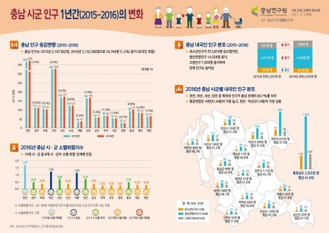 [로컬세계 송요기 기자]충남연구원은 1일 충남 시·군 인구 변화(2015~2016)를 인포그래픽으로 제작·발표했다.