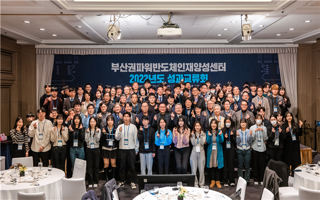 ▲지난 21일 부산시는 부산지역 13개 지역대학과 지역 강소기업의 교수 학생 임직원 등 관계자들이 반도체 산업발전의 핵심인 인재양성을 위해 추진한 ‘파워반도체 인재양성 공유대학’의 1차년도 사업이 성공적으로 마무리됨에 따라 성과교류회를 개최한 뒤 기념촬영을 하고 있다. 부산시 제공 |