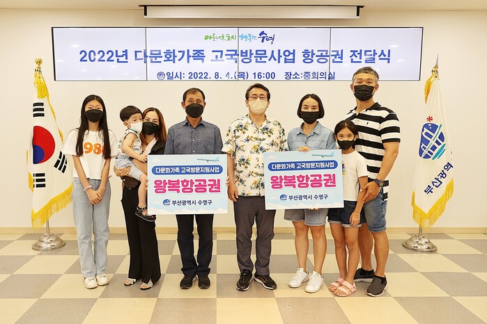 [로컬세계 부산=맹화찬 기자]부산시 수영구는 지난 4일 수영구에 거주하는 다문화가족을 초청해 고국방문 지원사업 왕복 항공권 전달식을 가졌다고 밝혔다.