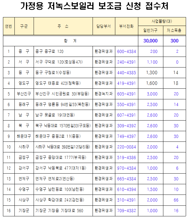 부산시 관계자는 "친환경 콘덴싱보일러는 배관설치가 불가능한 장소에는 설치가 제한될 수 있어 노후 보일러 교체를 희망하는 가정에서는 보일러 설치 대리점에 설치 가능 여부를 사전에 문의해야 한다"고 말했다.