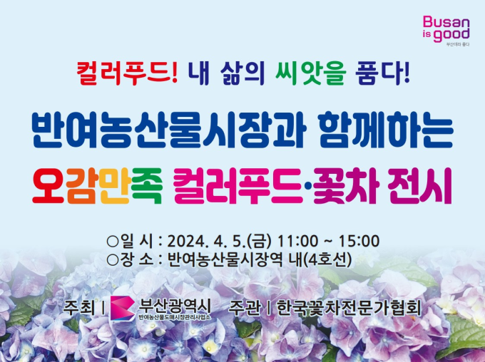 [로컬세계 부산=김민호 기자]부산시 반여농산물도매시장관리사업소는 5일 오전 해운대구 반여농산물시장역 역사에서 도매시장 유통종사자 및 방문 고객을 대상으로 「오감만족 컬러푸드·꽃차 전시회」를 개최했다.