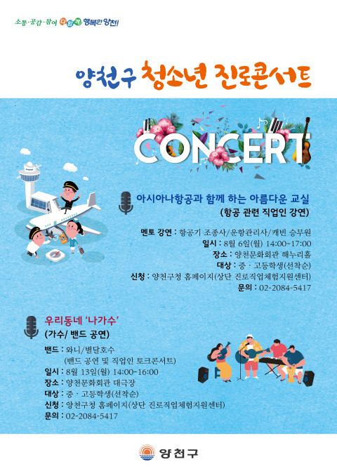 구 관계자는 “현재 활동하는 항공사 관련 멘토들의 생생한 현장의 이야기를 듣고, 밴드 공연도 관람하고, 관심있는 분야의 멘토들에게 궁금한 점들도 물어볼 수 있는 소중한 기회가 될 것”이라며 “중고등학생들의 많은 참여 바란다”고 말했다.