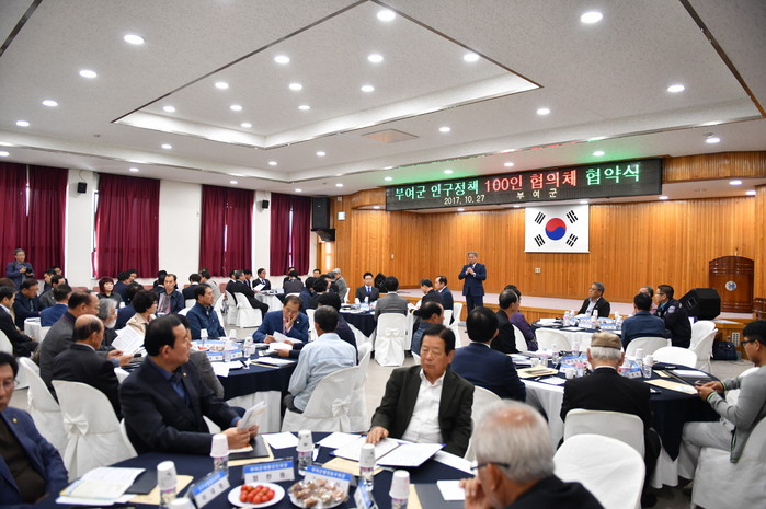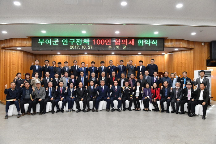 군은 지난 27일 여성문화회관에서 24개 기관장과 32개 관내 기업체, 44개 단체장 등 총100여 명이 참석한 가운데 부여군 인구증가 정책 추진을 위한 민관협의체 구성 및 협약식을 진행했다.