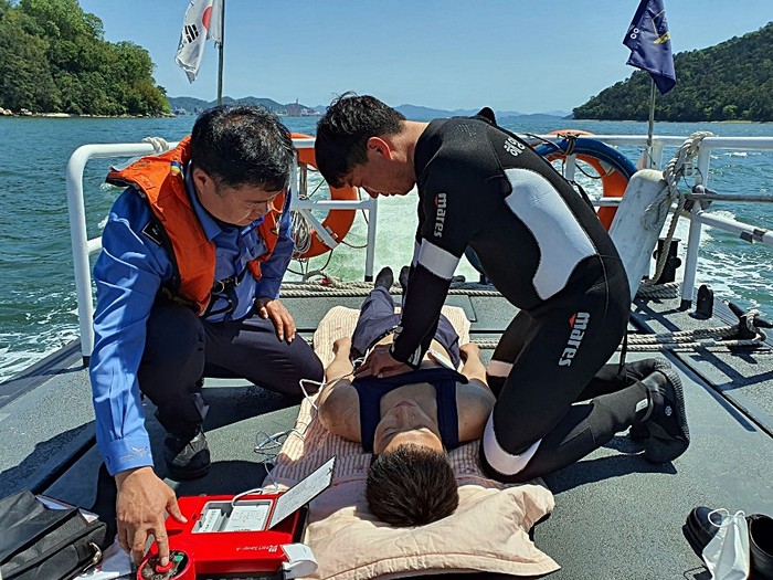 | ▲불시훈련 중 익수자를 대상으로 심폐소생술을 실시하고 있다. |
