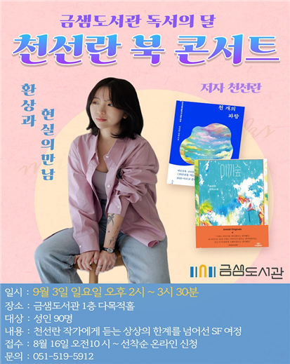 [로컬세계 부산=김의준 기자]부산 금정구 금샘도서관은 오는 9월 3일 오후 2시 부곡동에 위치한 금샘도서관 1층 다목적홀에서 '천선란 북 콘서트'를 개최한다.