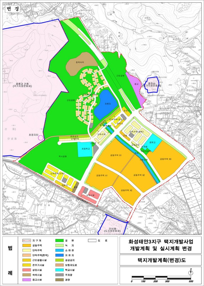 변경내용은 융·건릉과 용주사(범종)를 연결하는 옛길을 보존하고 사업지 북측에 한옥마을과 한옥숙박시설 등을 배치해 역사와 문화를 품은 한옥특화지역으로 개발하도록 했다. 또 약 3만㎡ 규모의 저류지와 수변공원 등 공원·녹지율이 전체 사업지구의 41.2%에 달해 환경친화적인 주거단지가 조성될 예정이다.