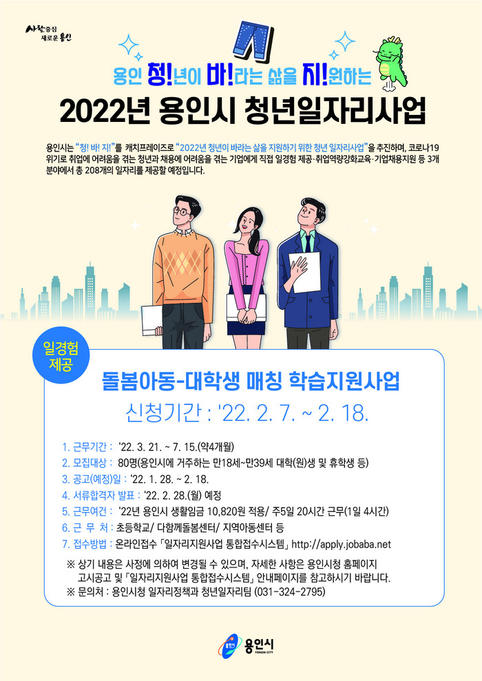 시 관계자는 “청년들에게는 일 경험을 제공하고, 아동들에게는 돌봄과 함께 학력격차를 줄일 수 있는 기회를 제공할 수 있다”며 “대학(원)생들이 많이 참여해주길 바란다”고 말했다.
