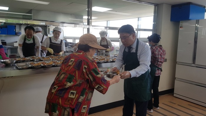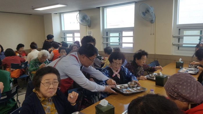 | ▲공한수 부산 서구청장은 취임 100일을 맞아 급식봉사활동에 나서며 어르신들에게 식사를 대접하고 있다.(서구청 제공) |