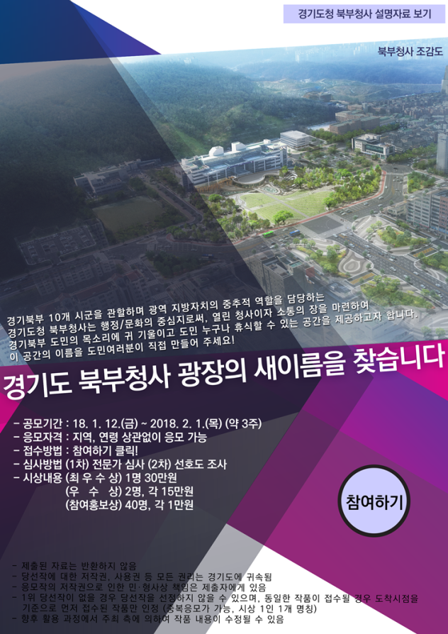 경기도는 오는 1월 12일부터 2월 1일까지 3주간 ‘경기도청 북부청사 광장 네이밍 공모전’을 개최한다고 11일 밝혔다.