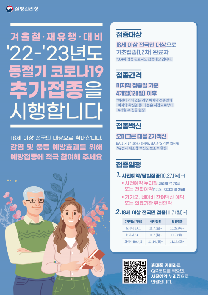 접종 백신은 2가백신(화이자·모더나)이다. 예방접종 사전예약 시스템 누리집 온라인 예약 또는 질병청 콜센터로 전화해 예약할 수 있다. 예약 없이 카카오톡·네이버 앱에서 잔여 백신 확인 후 의료기관에 별도로 연락해 당일 접종을 받아도 된다.