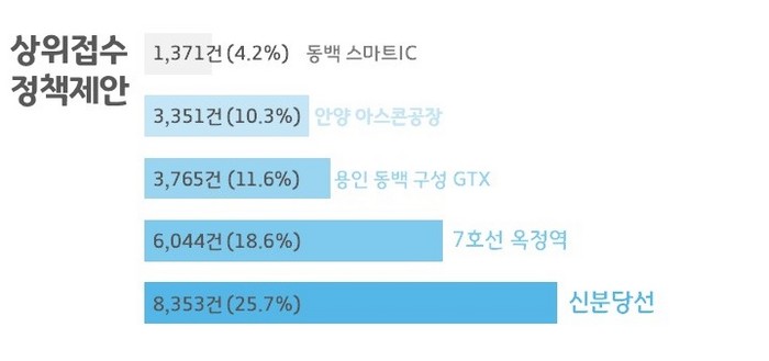 가장 많은 중복접수를 기록한 안건은 광교와 화서, 호매실, 봉담을 연결하는 신분당선 조속 연장 건의로 8353건(25.7%)이 접수됐으며 뒤를 이어 7호선 옥정역 연장요청 6044건(18.6%), 용인 동백 구성 GTX 건설 요청 3765건(11.6%), 안양아스콘 공장 이전 요청 3351건(10.3%), 동백스마트IC개통 1371건(4.2%)을 기록했다.