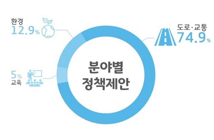 정책제안을 분야별로 나눠보면 도로.교통분야가 74.9%로 가장 많았고 환경분야 12.9%, 교육분야 5% 순으로 나타났다.