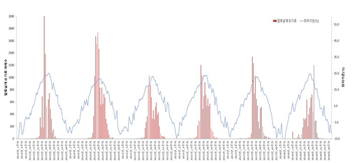 | ▲2013~2018년 주별 평균 최저기온과 말라리아 매개모기 개체수. |