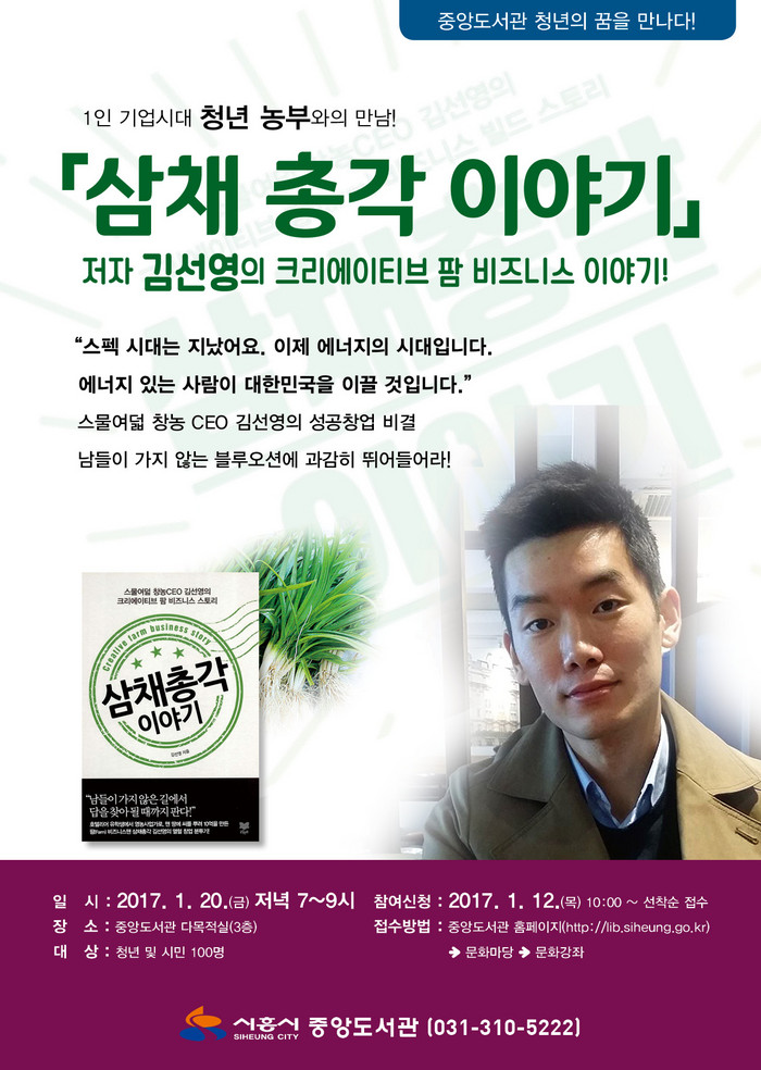 [로컬세계 주덕신 기자]시흥시 중앙도서관은 오는 20일 ‘삼채총각 이야기’ 저자 김선영 청년농부와의 만남 행사 및 강연회를 개최한다.