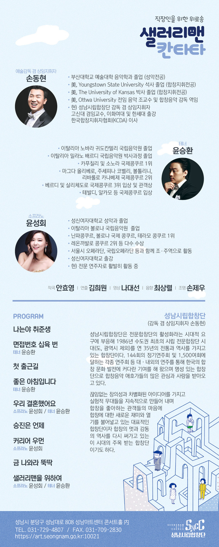 [로컬세계 김병민 기자]경기 성남시립합창단은 오는 9월 7일과 8일 오후 7시 30분 성남아트센터 콘서트홀에서 직장인의 애환을 노래하는 창작 공연 ‘샐러리맨 칸타타’를 무대에 올린다고 27일 밝혔다.
