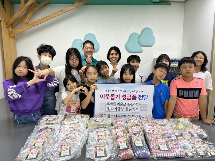 북구 청소년 문화의 집 등대학교 학생들이 직접 만든 기부 물품은 천연 비누 32개, 바다 유리 그립톡 22개, 양말목 가방 15개, 바다 유리 냄비 받침대 20개 등 총 4가지 물품이다.