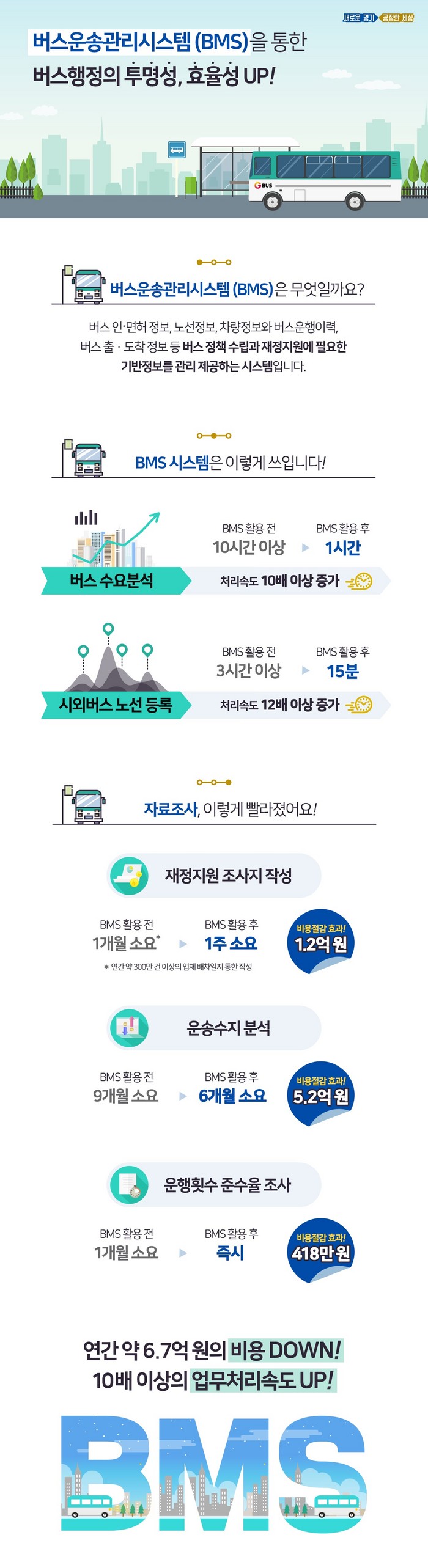 김상수 도 버스정책과장은 “지난해부터 보다 전문화된 BMS 관리운영을 위해 버스정책과 내에 BMS운영팀을 신설해 운영하고 있다”며 “앞으로도 더 편리하고 진화된 시스템 구현을 위해 2021년부터 2차 BMS 고도화 사업을 추진해 나갈 계획”이라고 말했다.