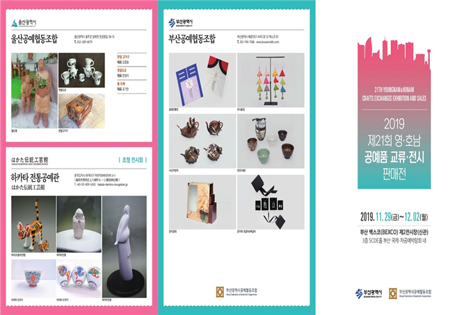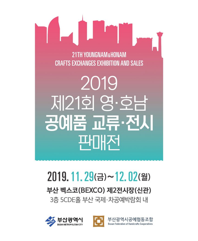 부산시(시장 오거돈)는 부산시공예협동조합(이사장 최종일) 주관으로 ‘제21회 영호남 공예품 교류 전시판매전’이 29일부터 12월 2일까지 벡스코 제2전시장에서 개최된다고 밝혔다.