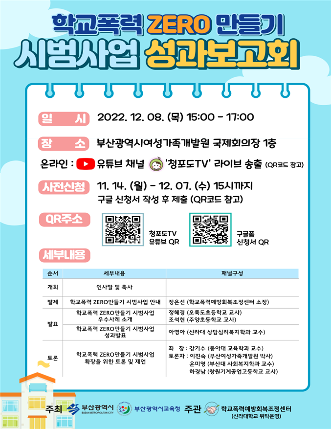 현장 참석은 시 학교폭력예방회복조정센터 누리집을 통해 오는 7일 오후 3시까지 사전 접수로 진행되며, 온라인은 부산시청소년종합지원센터 공식 유튜브 채널 ‘청포도TV’를 통해 시민 누구나 시청할 수 있다. 사전 참가 신청자에게는 추첨을 통해 기프티콘을 제공할 예정이다.