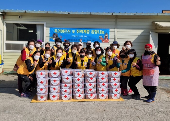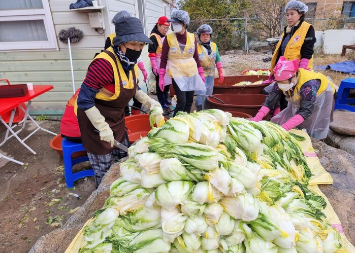 [로컬세계=정연익 기자] 강원 대한적십자사 강원도지사 홍천봉사회(회장 김경자)는 1일과 2일 홍천 결운리 일원에서 봉사원들과 함께 사랑의 김장을 담가 독거어르신 및 저소득 취약계층과 장애인 가구 등 70가구에 전달하는 엄마 손 맛 사랑의 김장김치 나눔 이웃사랑을 실천했다.