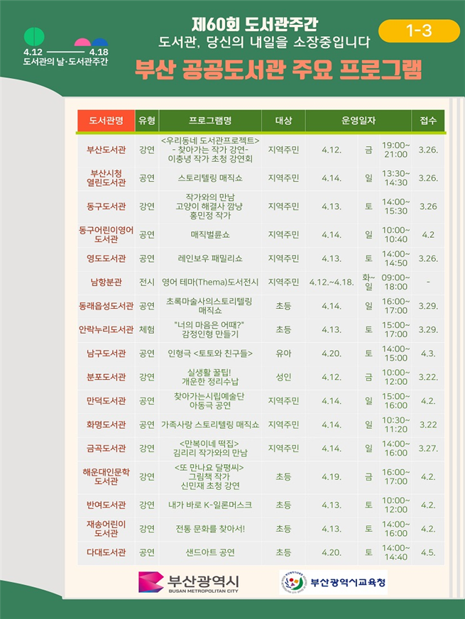 행사 안내와 참여는 부산도서관 포털(library.busan.go.kr/portal) 및 개별 공공도서관 누리집을 통해 확인할 수 있다.