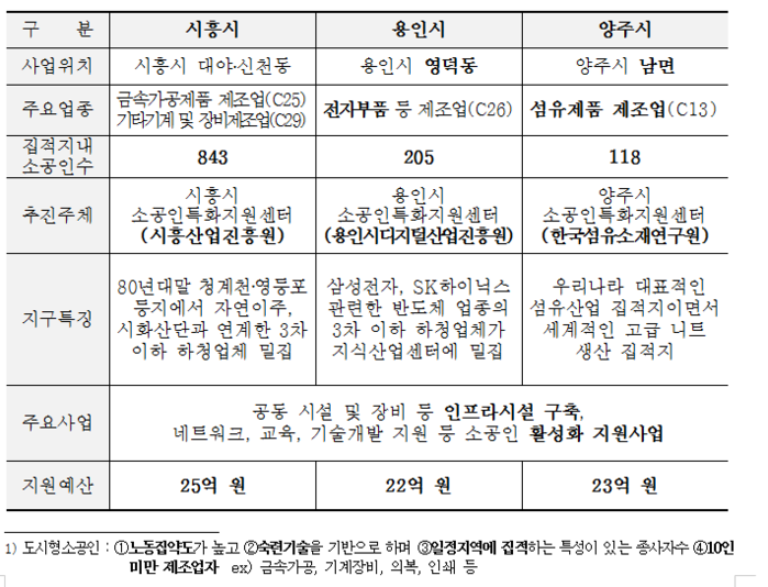 3곳의 집적지구는 2020년까지 3년간 총 70억원(국비 40억원, 지방비 30억원)을 지원받아 소공인 활성화를 도모하게 된다. 시군별로는 시흥 25억원, 용인 22억원, 양주 23억원이 지원된다.
