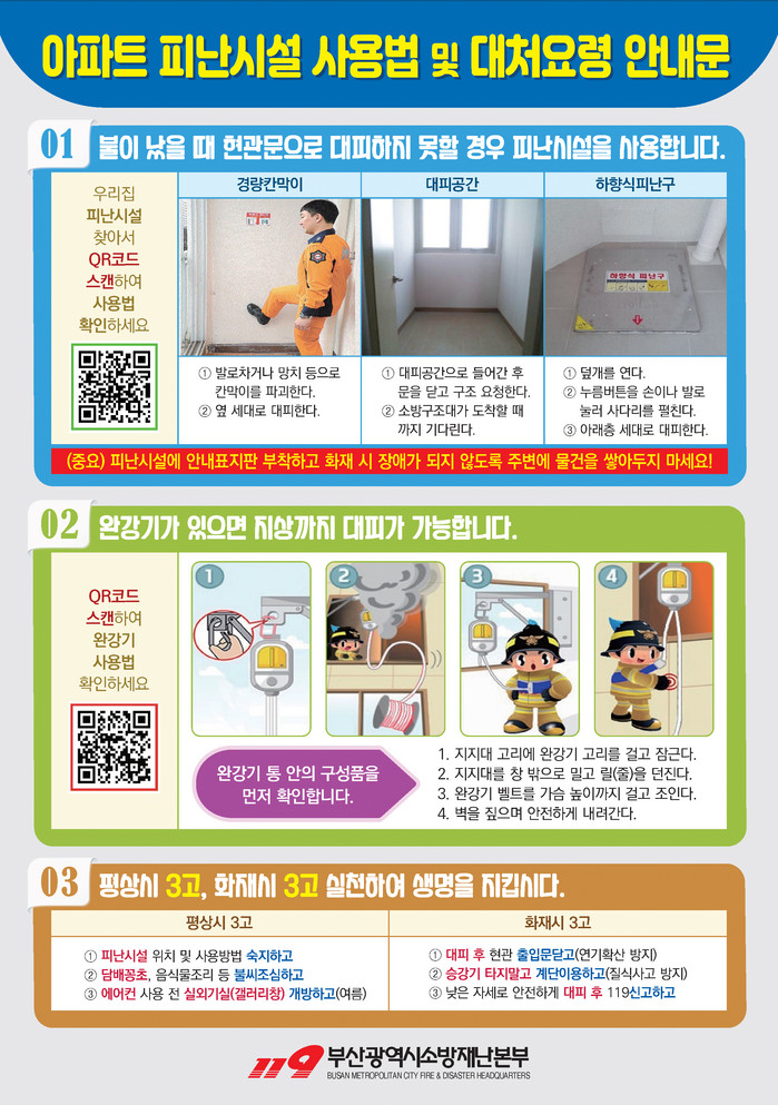 이에 부산소방재난본부는 QR코드를 이용한 피난시설 및 완강기 사용법을 보기 쉽게 안내문으로 제작해 아파트 엘리베이터 등에 부착하여 평상 시 사용법을 숙지할 수 있도록 홍보에 나섰다.