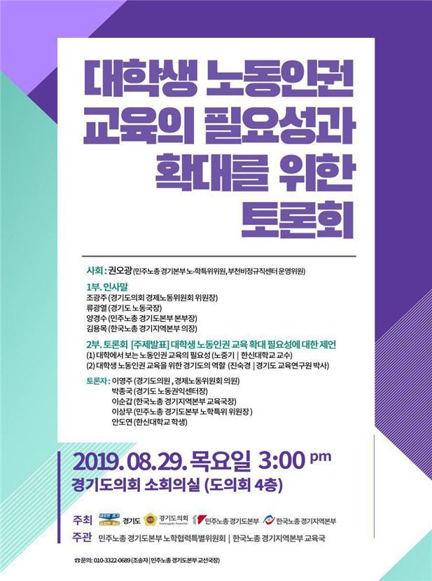 토론자로는 이영주 경기도의원, 박종국 경기도 노동권익센터장, 안도연 한신대학교 학생, 이순갑 한국노총 경기지역본부 교육국장, 이상무 민주노총 경기도본부 노학특위 위원장 등이 참가한다.