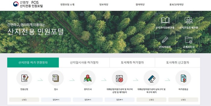 산지전용통합정보시스템 민원 포털에 접속해 원하는 민원 업무를 클릭하고, 온라인으로 민원 신청서를 작성한 후 접수 기관을 선택해 제출하면 된다.