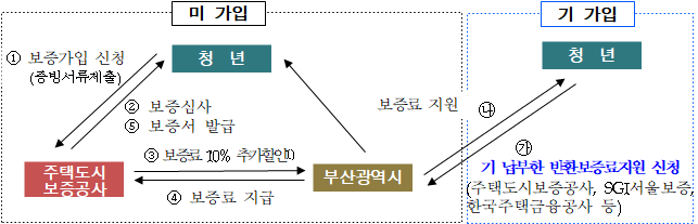 ▲부산시 ‘청년안심 전세보증금반환보증 보증료 지원사업’ 구조표. 보증보험 미가입자와 가입자로 구분, 지원된다. 부산시 제공 |