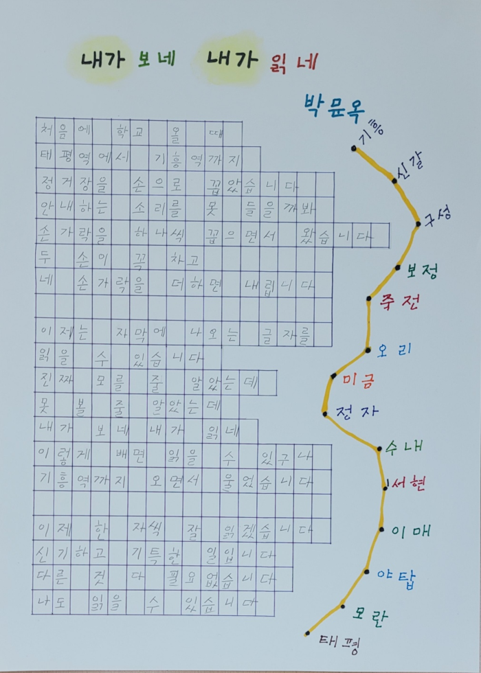 지난 6월 국가평생교육진흥원이 ‘문해, 배움은 늘 신기하다’는 주제를 바탕으로 주최한 성인문해교육 시화전에서 신갈야간학교의 박문옥(69)씨가 출품한 ‘내가 보네, 내가 읽네’가 사회부총리겸교육부장관상인 ‘글꿈상’에 선정됐다.