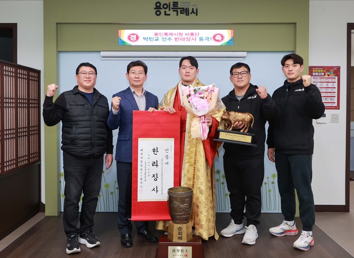 [로컬세계=김병민 기자]경기 용인특례시는 지난 4일 시청 시장실에서 시 직장운동경기부 씨름단 박민교 선수의 두 번째 한라장사 봉납식을 열어 우수한 성적으로 대회를 마친 선수단을 격려했다.