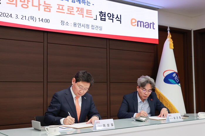 이날 시청 접견실에서 열린 협약식에는 이상일 용인특례시장과 유근종 이마트 판매3담당, 지역 내 7곳의 이마트(죽전·흥덕·보라·TR구성·용인·수지·동백) 점장들이 참석했다.
