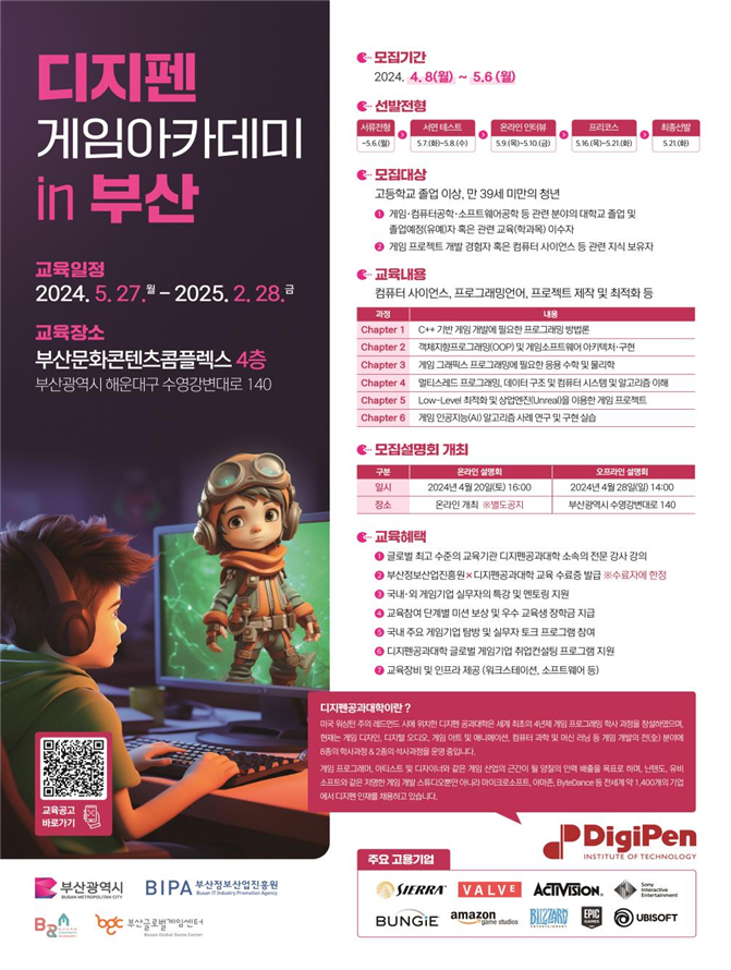 시는 美 디지펜 공과대학(최고운영이사 제이슨 추)과 체결한 ‘글로벌 게임 인재 양성과 게임산업 창업생태계 조성’ 업무협약을 바탕으로, 전문 게임개발자 양성을 위해 (재)부산정보산업진흥원 부산콘텐츠아카데미 내 이번 교육 과정을 개설해 운영한다.