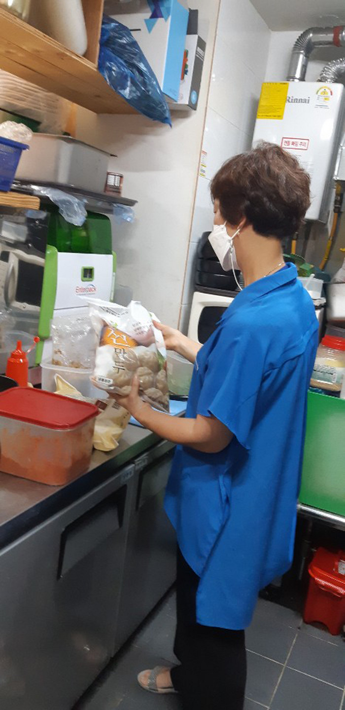 | ▲어린이 기호식품 전담관리원이 학교 주변 분식집에서 만두 식품의 유통기한을 살피고 있다, 성남시 제공 |