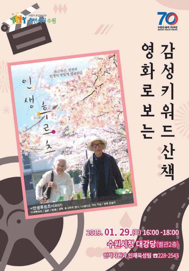 ‘영화로 보는 감성 키워드 산책’은 영화 ‘인생 후르츠’ 상영과 염태영 수원시장이 패널로 참가하는 ‘차근차근, 천천히! 토크쇼’ 등이 진행된다.