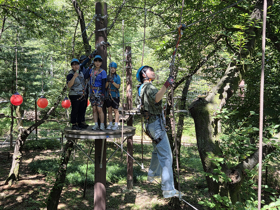 지난해 관악산 모험숲에 참여한 청소년이 공중 모험 코스를 체험하고 있다. 관악구 제공