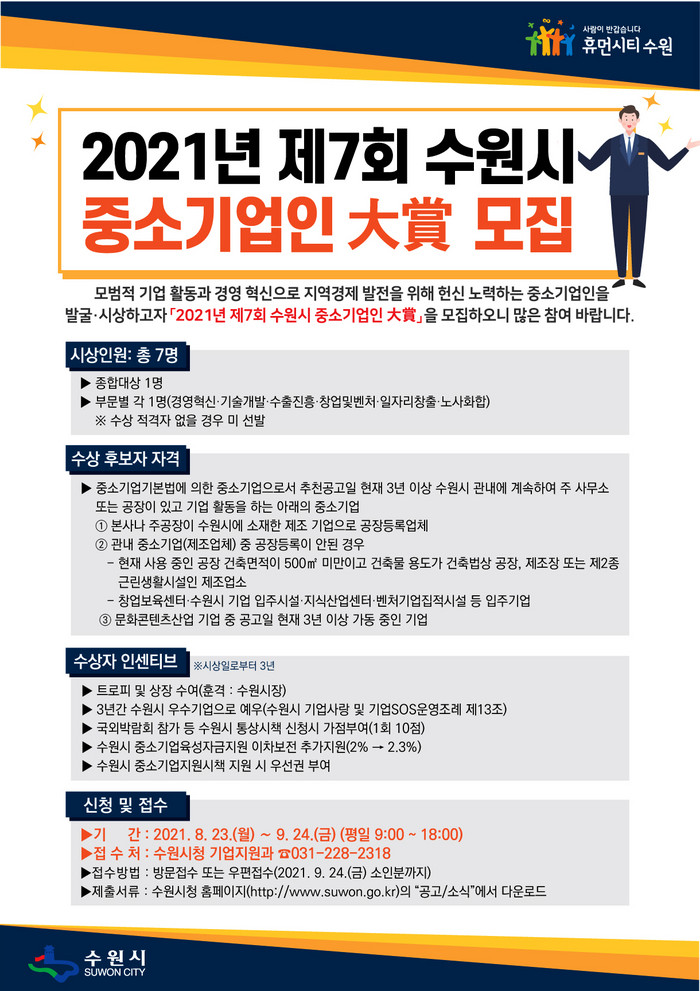 수원시 홈페이지 ‘공고/고시/입법예고’에 게시된 ‘2021년 제7회 수원시 중소기업인 대상 선정 계획 공고’에서 제출서류 서식을 내려받아 23일부터 9월 24일까지 수원시청 기업지원과에 방문·우편 신청해야 한다.