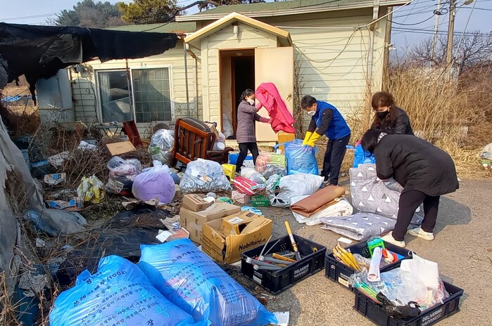 지난 24일 협의체 위원 10명은 대상 가구를 찾아가 집 곳곳에 쌓인 생활 쓰레기 100리터짜리 20개 분량을 수거하고 청소까지 마친 뒤 겨울 이불 세탁 등을 도왔다.