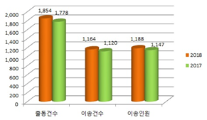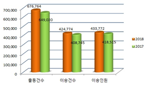 이는 2017년과 비교하면 출동건수는 2만7744건(4.3%), 이송건수는 1만6029건(3.9%), 이송인원은 1만5257명(3.6%)이 늘어난 수치다.