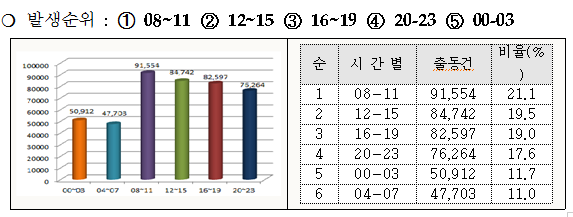 시간대별로 보면 오전 8시에서 저녁 7시 사이가 전체의 59.6%를 차지해 출퇴근과 활동량이 많은 낮 시간대에 구급활동이 많은 것으로 나타났다.