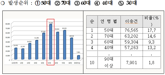 연령별로는 50대가 7만6565건(17.7%)으로 가장 많았고, 70대 6만3202건(14.6%), 60대 5만9304건(13.7%), 40대 5만7263건(13.2%), 30대 4만1286건(9.5%)순으로 나타났다.